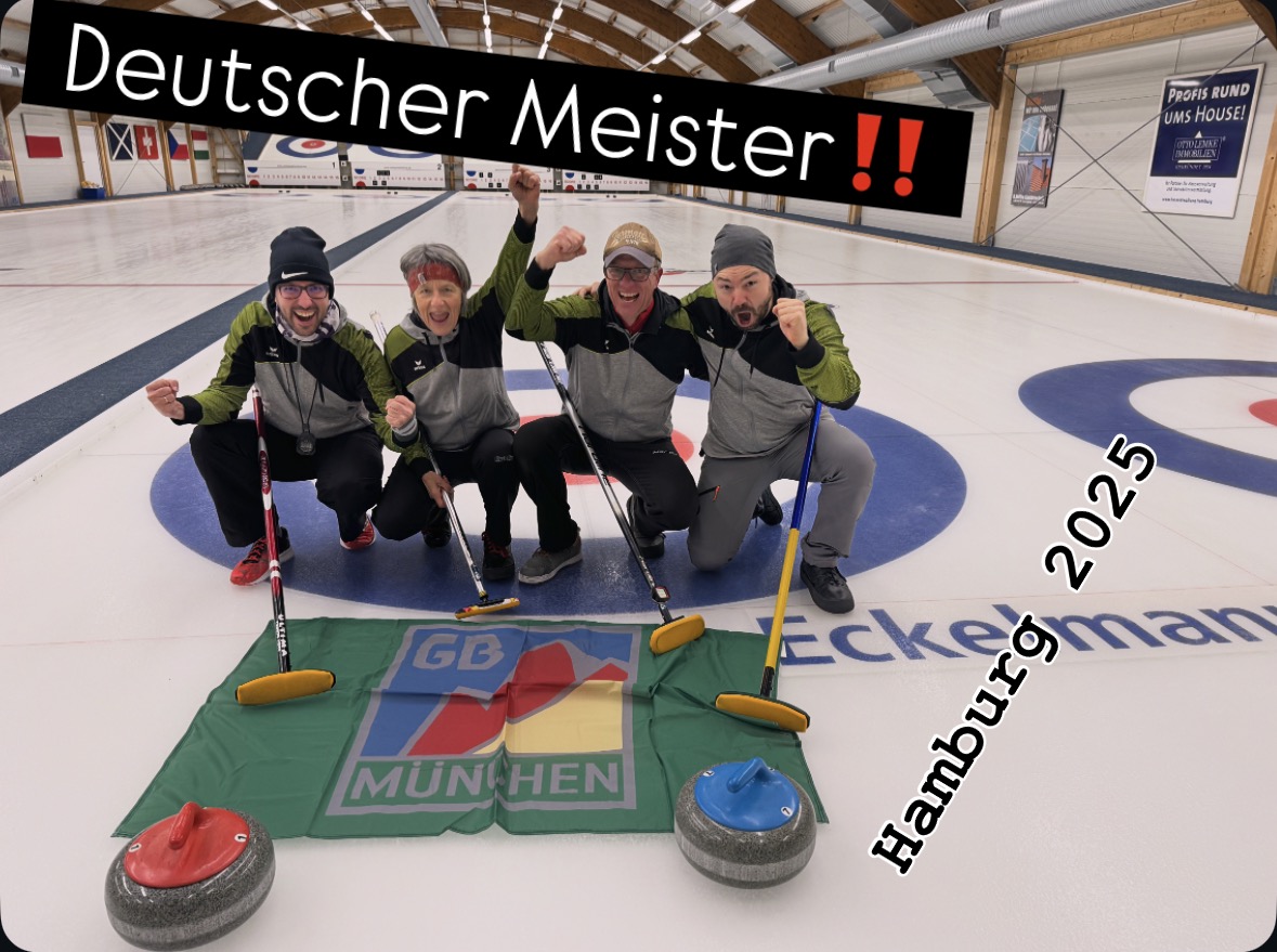 Wir konnten immer noch zwei Medaillen gewinnen. Am Sonntag besiegte GBF München I ihren Gegner aus Kassel. Sie konnten ihren anfänglichen Rückstand kontern und die Bronzemedaille gewinnen. Im Finale standen sich zwei starke Teams gegenüber. Erfurt I startete mit 4 Steinen nach zwei Ends stark. GBF München II arbeitete sich mit guten Spielzügen ins Spiel zurück und konnte auf 4:2 verkürzen. Nach 5 Ends stand es 5:4 für Erfurt I. Ein Stein für uns bedeutete Gleichstand und LSD. Im sechsten End konnten wir unseren Stein sehr gut positionieren und Erfurt I gelang kein eigener Punkt mehr. Das Herzschlagfinale wurde zu einem echten Drama. LSD – Zielschießen mit Abstandsmessung. Der Skip von Erfurt legte sehr gut vor. Haas konnte dem allergrößten Druck widerstehen und platzierte gekonnt unseren Stein näher am Haus als der Gegner. Plötzlich waren wir deutscher Meister. Nach diesem Wahnsinnsspiel feierten wir ausgelassen. Mit dem Wanderpokal und der restlichen Ausbeute im Gepäck ging es wieder zurück nach Hause.