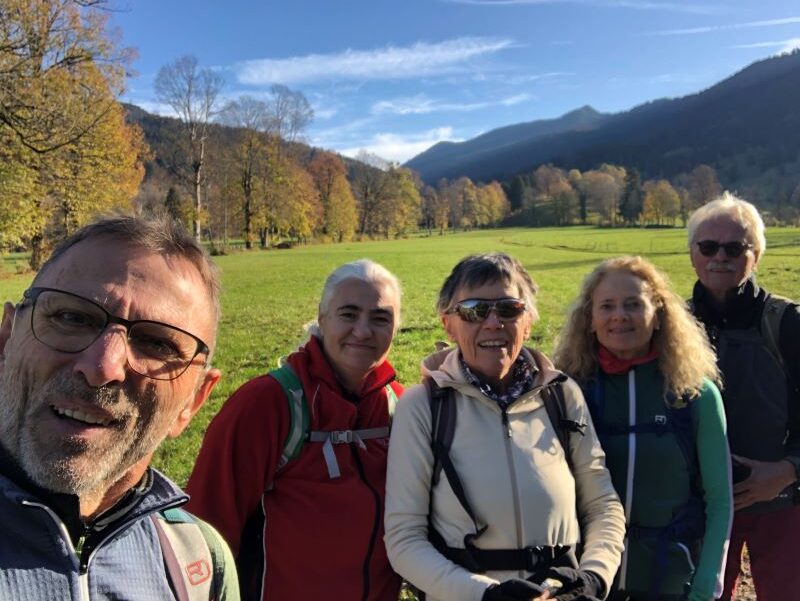 Zur Herbst Bergtour am 09. November fuhren wir zu fünft – Annemarie, Barbara, Ecaterina, Hermann und ich mit dem Zug nach Lenggries. Bis vor Bad Tölz lag dichter Nebel im Tal, nach Bad Tölz lichtete sich der Nebel und die Sonne schien zur unserer Freude. Vom Bf Lenggries (680m) gingen wir am Kloster Hohenburg, durch die bäuerlich geprägten Weiler Mühlbach und Tradln vorbei zum Grasleitensteig.