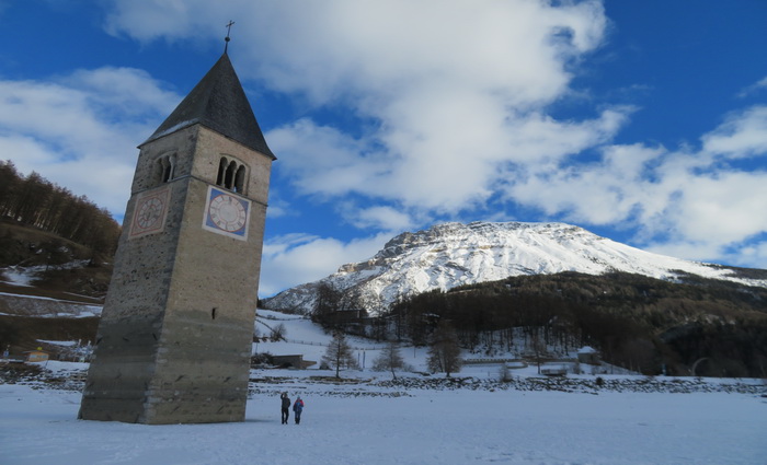 Hier mit dem Wahrzeichen des Reschensee, Godo und Vera bummeln auf dem zugefrorenen See