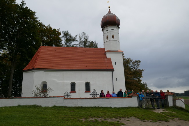 Robert Rieger, unser Senioren-Beauftragter, hatte dieses Mal ein Schmankerl im Osten von München vorbereitet. Es war eine Wanderung vom Feinsten, nur das Wetter zeigte sich im Grau. Somit vermissten wir die leuchtenden Farben des goldenen Oktober. Aber doch kann man sich an die Schönheit der Natur einfühlen, wenn man die beigefügten Bilder betrachtet. Die 4- Weiher- und Seenkette war eine Augenweide, gekrönt mit der Sankt Michaels Kapelle, von der wir einen Super-Ausblick auf den malerischen Egglburger See und Ebersberg mit Krankenhaus hatten. Unterhalb der Kapelle vesperten wir mit den Kühen in Nachbarschaft.