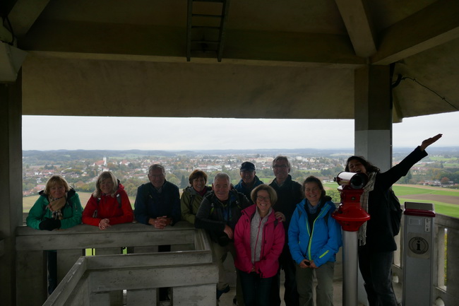 Bis zum weiteren Endziel dem 35-m-hohen Aussichtsturm auf der Ludwigshöhe, ging es zunächst am Egglburger See entlang, ehe uns die vielen Wege und Pfade im Wald verwirrten. Aber dank GPS fanden wir den Turm, der dominant am Waldesrand und einem Wiesenhang stand. Viele Gedenktafeln um den Turm angebracht, erinnerten an die Toten im 1. Weltkrieg. Elf unserer dreizehn Wanderfreunde -innen, ließen es sich nicht nehmen, die Stufen des Turms hinaufzusteigen, um den dortigen Ausblick auf Ebersberg nicht zu versäumen.